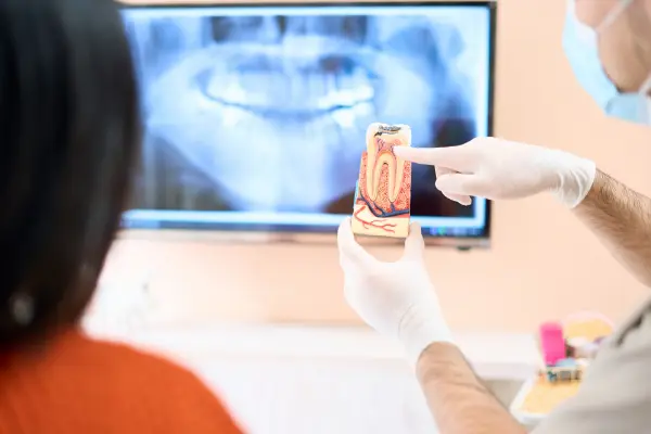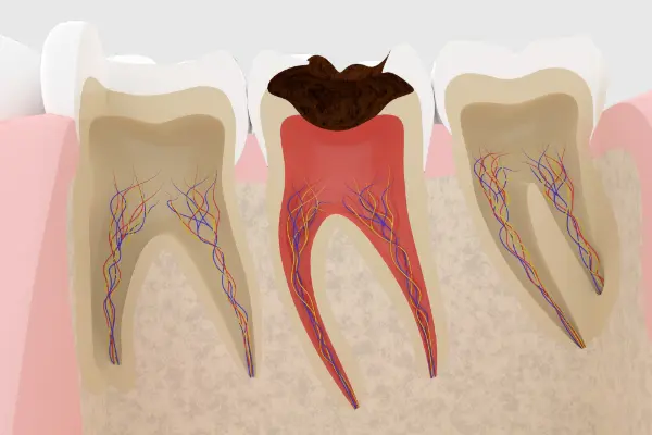 むし歯が進行し、歯の神経(歯髄)にまで及ぶと、神経が細菌に感染して強い痛みが出たり、歯ぐきが腫れたりすることがあります。状態が悪化すると、最終的に歯を残せなくなる可能性もあります。 神経が感染してしまった場合は、原因となる感染部分を取り除き、根管(神経が通っている管)の内部をきれいに清掃・消毒する処置が必要になります。この治療を「根管治療」と呼びます。 また、過去に治療を受けた歯であっても再感染が起こり、歯の根の先(根尖)に膿がたまるケースがあります。そのような場合にも、改めて根管治療を行う必要があります。 根管治療は非常に繊細で専門性の高い処置であり、一定の治療期間を要します。しかし、治療後にかぶせ物を装着するための大切な土台となるため、歯を長く守るうえで欠かせない重要な治療です。